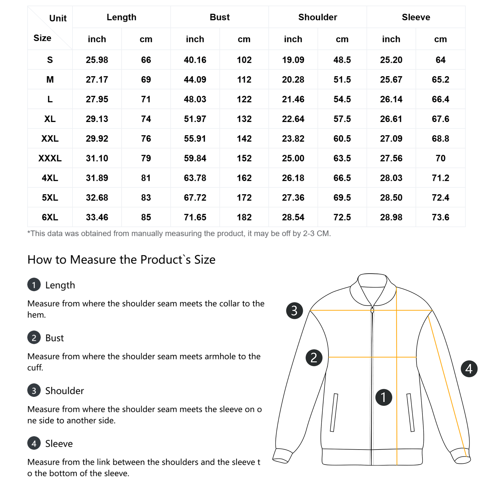 The measurement data of this size is obtained by laying clothes flat. Due to different measurement methods, it is normal that the error is within 2-3cm.