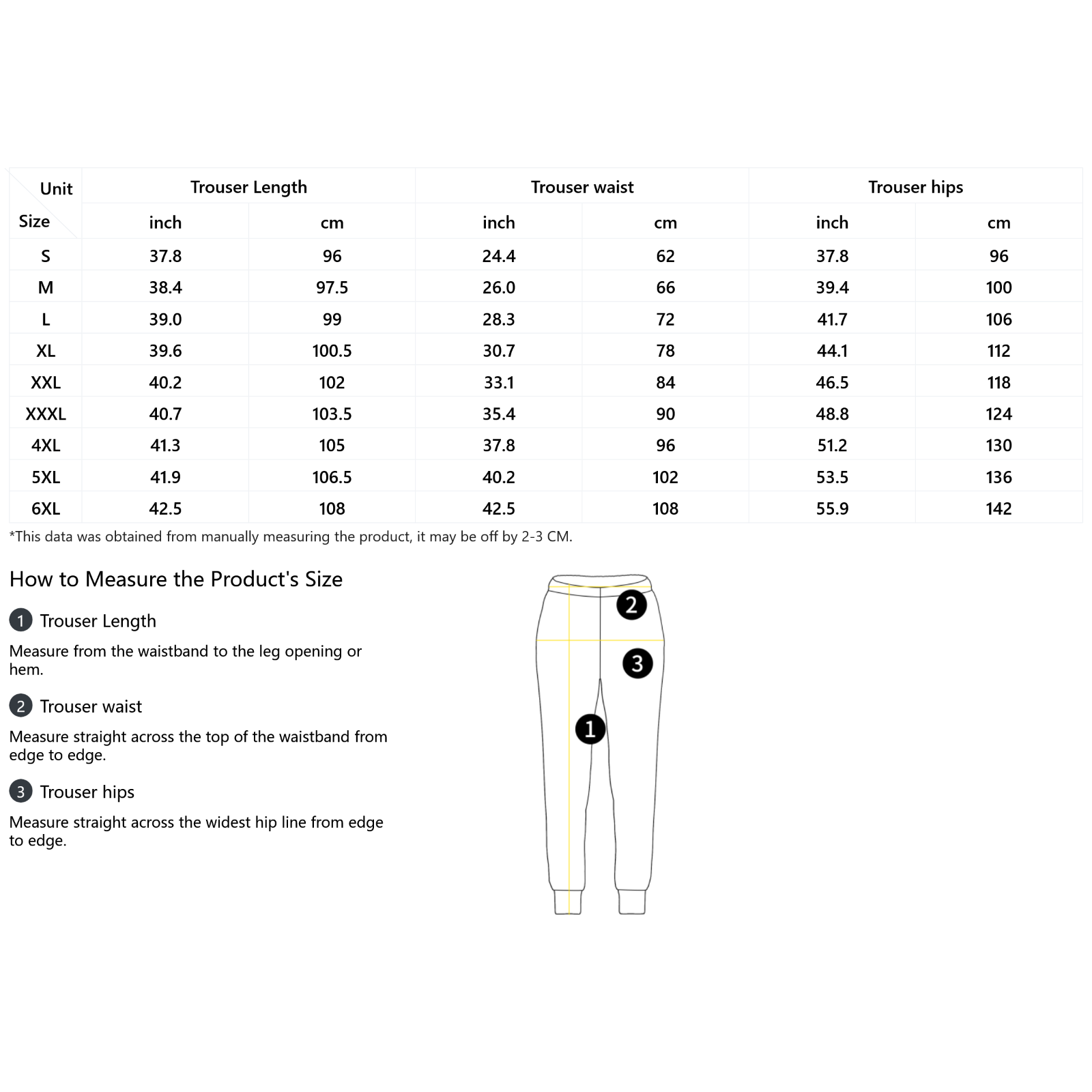 | Size | Trouser Length | Trouser waist | Trouser hips |