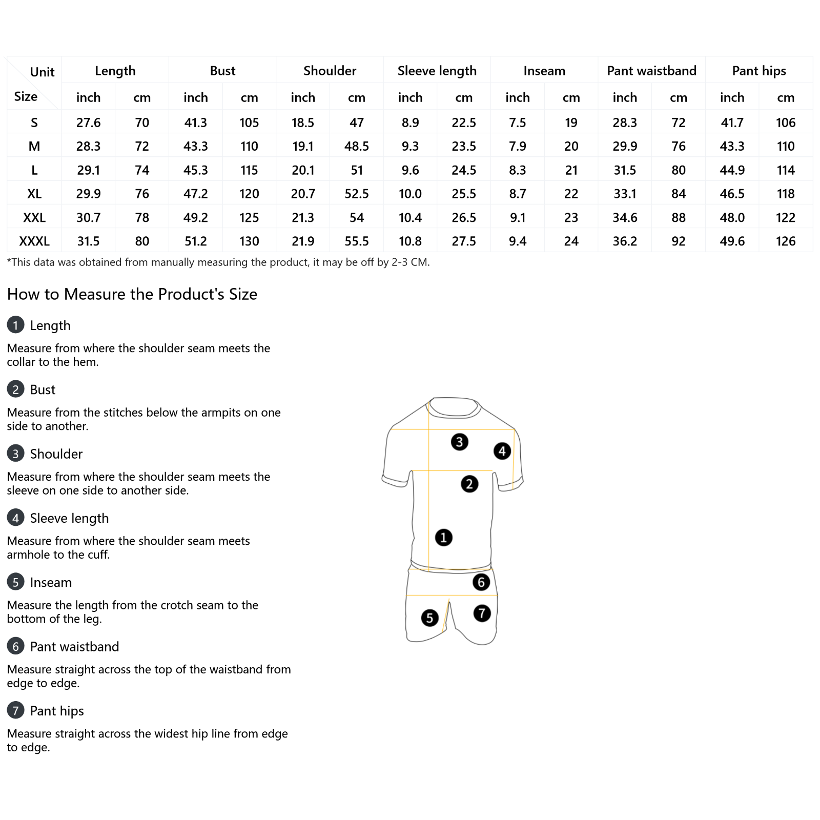 | Size | Length | Bust | Shoulder | Sleeve length | Inseam | Pant waistband | Pant hips |